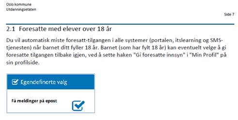 Hvis eleven og de foresatte blir enige om at det er lurt at de foresatte kan fortsette å ha full kontakt med skolen også etter at elevene har fylt 18 år, kan de fylle ut en samtykkeerklæring. Erklæringen underskrives av eleven og leveres på skolens kontor.